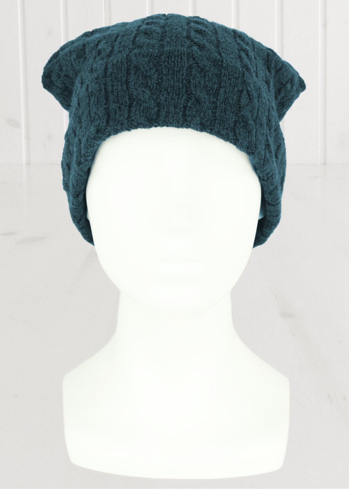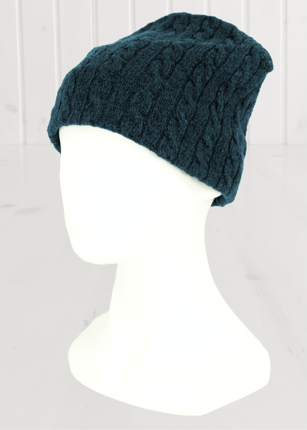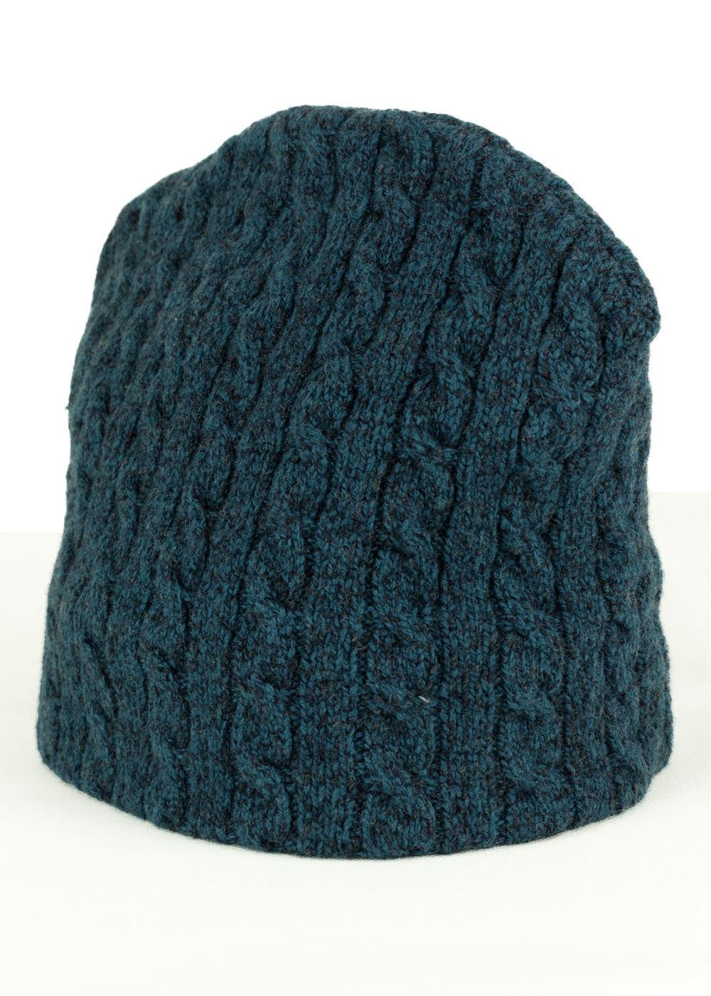 Die Wollmütze ist aus reiner Wolle in den Farben Navy und Teal-Blue mit Zopfmuster.